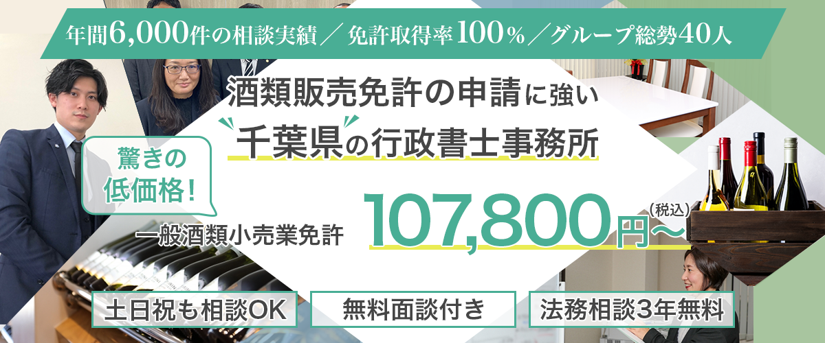 弊所、行政書士の高い知見とノウハウにより、千葉県全域のお客様の酒類販売の免許取得の成功率100%のご支援品質を維持しております。